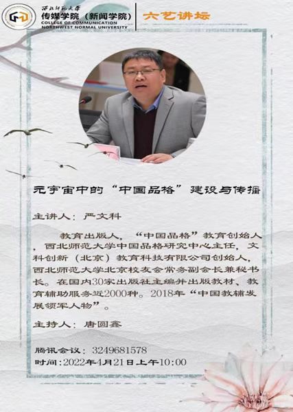 2022年4月21日上午,金沙990活动大厅中国品格研究中心主任严文科就“元宇宙中的‘中国品格’建设与传播”这一主题展开学术讲座,本次讲座由我院讲师唐圆鑫主持。