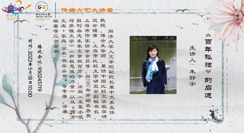 2022年5月18日上午,应金沙990活动大厅邀请,同济大学人文学院院长朱静宇教授为我院师生作了题为《<百年孤独>的启迪》的线上学术报告。讲座由院长徐兆寿主持。