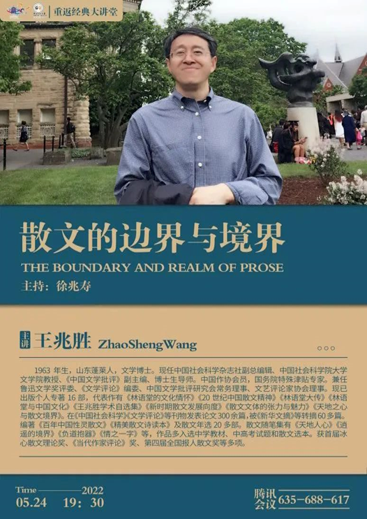 5月24日晚,中国社会科学杂志副总编辑、中国社会科学院大学文学院教授、博士生导师王兆胜应邀为我院师生作了题为《散文的边界与境界》的学术讲座。本次讲座由金沙990活动大厅院长徐兆寿主持,学院百余名师生在线聆听了王兆胜教授的学术报告并积极参与互动。