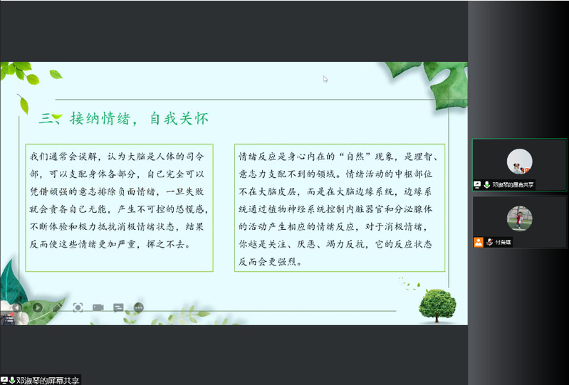 生活中处处有压力,那压力是如何占据我们心灵的呢?邓淑琴为学生们详细讲解了压力的产生与形成过程,以及压力较大时身体产生的反应。针对考前焦虑,邓淑琴讲道:“我们要以正确的心态看待压力,紧张焦虑是正常的心理反应,适度的焦虑其实有助于我们取得更好的成绩。”此外,她还讲解到焦虑的来源、症状表现等相关知识,帮助同学们正确判断自己的心理状况,以便及时调整心态。