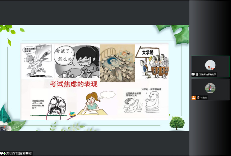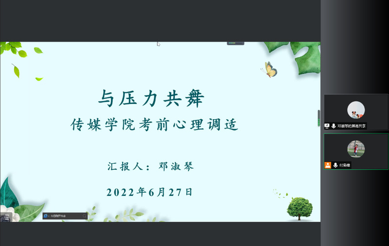 为做好学生考前心理调适,缓解心理焦虑,6月27日晚7点半,金沙990活动大厅党委学生工作部学生心理健康指导服务中心老师邓淑琴应邀为我院学生开展题为《与压力共舞》的线上心理讲座。本次讲座由金沙990活动大厅团委书记付枭雄主持,学院全体学生参加。