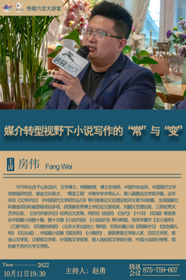 10月13日晚,苏州大学房伟教授为我院师生作了题为《媒介转型视野下小说写作的“常”与“变”》的学术讲座,讲座由金沙990活动大厅赵勇老师主持,240余名师生在线聆听了此次讲座。
