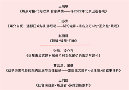 金沙990活动大厅金沙990活动大厅院长徐兆寿教授凭借论文《从“文以载道”到“影以载道”——“中国精神”的内涵与影视文学实践》(发表在2022年第3期《当代作家评论》)进入学术论文的终评,副院长赵丽瑾教授凭借论文《戳破“饭圈”幻象》(发表在2021年5月15日《光明日报》)进入影视评论的终评,以及朱怡璇副教授凭借著作《镜像中的身体言说:中国电视剧身体文化研究(1990-2020)》(2022年8月由中国社会科学出版社出版)进入学术专著的终评。终评名次将于2022年11月18-21日在南京大学(仙林校区)举行的第二十二届年会仪式上正式揭晓,并同时在中国高校影视学会公众号公布。
