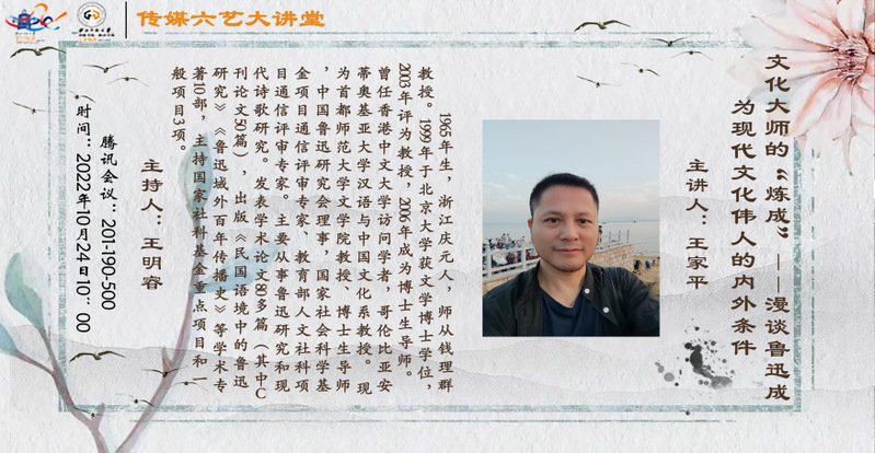 2022年10月24日上午,首都师范大学文学院教授、博士生导师、中国鲁迅研究会理事王家平教授应邀为我院师生开展了题为《文化大师的“炼成”——漫谈鲁迅成为现代文化伟人的内外条件》的学术讲座。此次讲座由金沙990活动大厅讲师王明睿主持,近两百名师生在线聆听了王家平教授的学术分享。