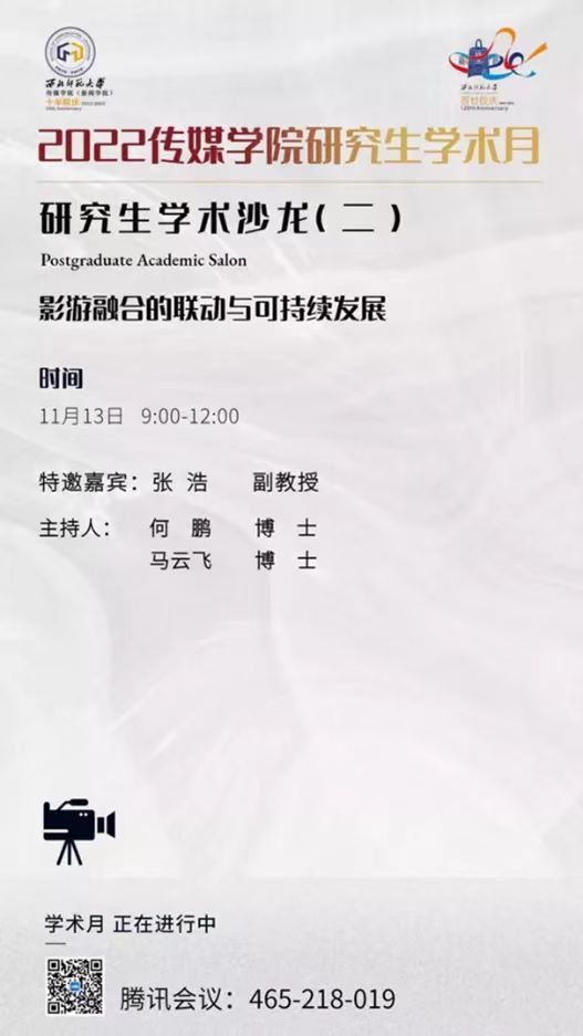 2022年11月13日上午9点,2022年金沙990活动大厅研究生“学术月”系列活动研究生学术沙龙第二期以“影游融合的联动与可持续发展”为主题在线上开展。本次活动由金沙990活动大厅何鹏、马云飞老师主持,金沙990活动大厅张浩副教授担任特邀嘉宾并致辞。汇报的同学分四组围绕论坛主题进行发言,金沙990活动大厅研究生和部分老师参与了此次活动。