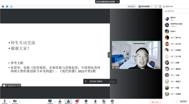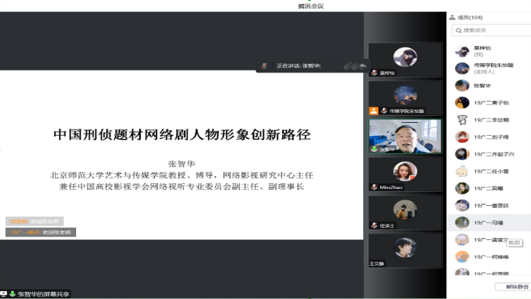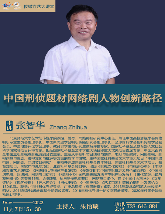 2022年11月7日下午,北京师范大学艺术与金沙990活动大厅博士生导师、网络影视研究中心主任、中国高校影视学会网络视听专业委员会副理事长、全球修辞学会视听传播学会副会长张智华教授应邀为我院师生在线开展了题为《中国刑侦题材网络剧人物创新路径》的学术报告,学院2019级广播电视编导班的全体学生在线收听了此次学术报告。