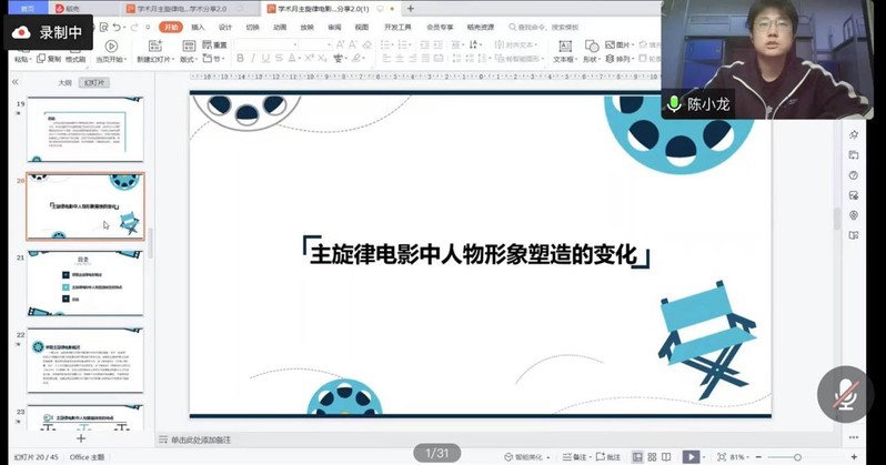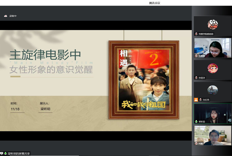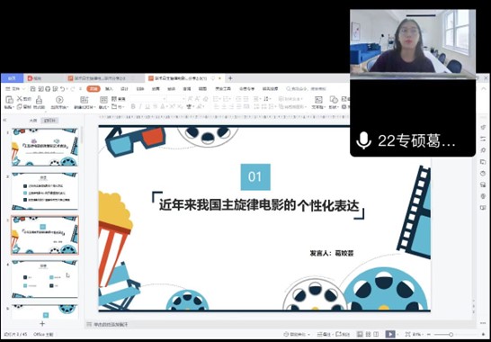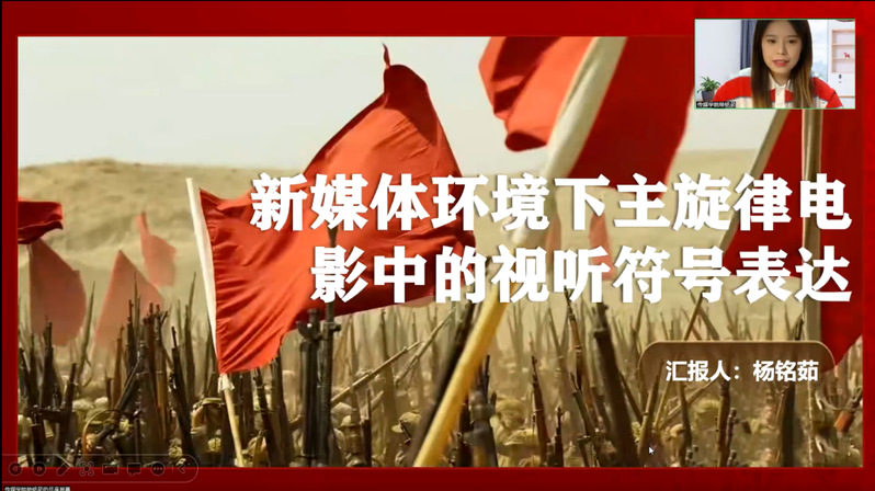 杨铭茹同学以《新时代语境下主旋律电影中视听符号的表达》为题,解析了主旋律电影的概念,以主旋律电影中的视觉、听觉符号展开论述。