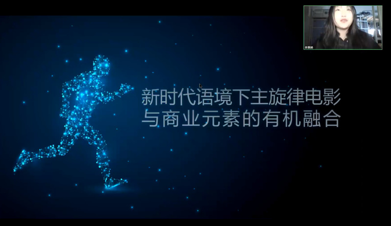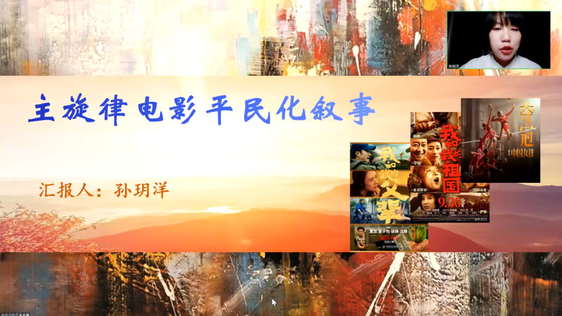 陈慧娟同学以《新时代语境下主旋律电影与商业元素的有机融合》为题,以历史为线索,梳理了主旋律电影诞生期、发展期、探索期、崛起期的商业化探索,以及新时期的主旋律电影和商业元素结合等问题。
