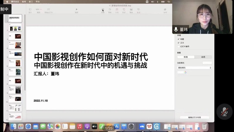 董玮同学以《新时代背景下中国影视创作的机遇与挑战》为题,从历史脉络和时代背景两个方面探讨了短视频对中国影视创作的冲击。