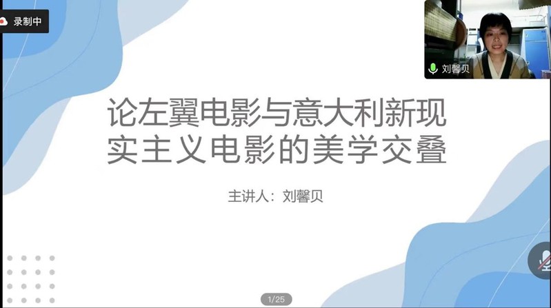 刘馨贝同学以《左翼电影与意大利新现实主义电影的艺术交叠》为题,从社会背景、现实主义转向、现实主义的内部升级为视角对电影意识形态、自觉意识等问题展开论述。