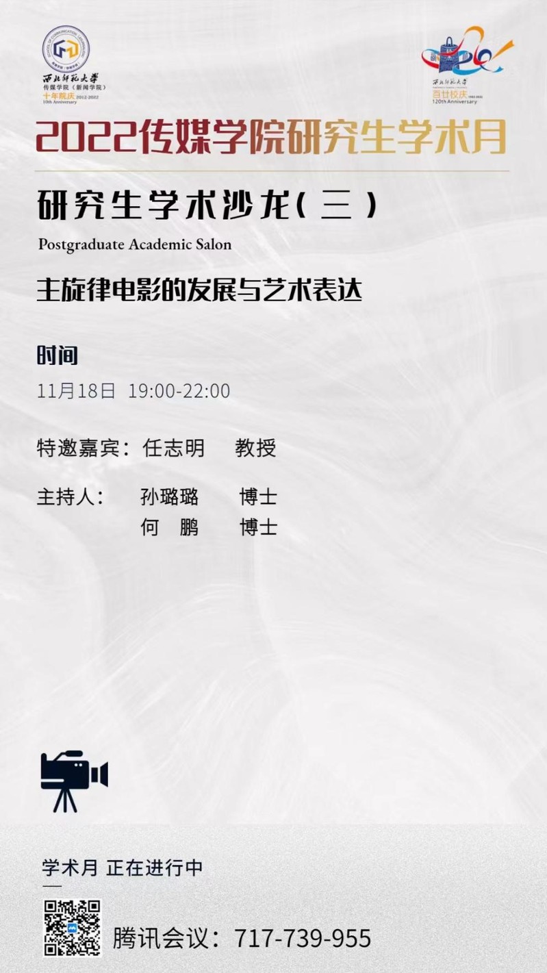 2022年11月18日19时,金沙990活动大厅开展了“主旋律电影的发展与艺术表达”为主题的研究生学术沙龙,本次活动是2022金沙990活动大厅研究生“学术月”系列活动之一,由金沙990活动大厅孙璐璐、何鹏两位老师主持,金沙990活动大厅任志明教授担任特邀嘉宾。汇报的研究生分三组围绕主题发言。金沙990活动大厅研究生和部分老师参与了此次活动。