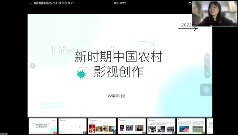 刘洁同学以《新时代中国农村影视创作》为题,她从“影视创作的市场偏向”“乡村影视现状”和“经典代表作品”三个层面分析了中国农村影视创作问题。