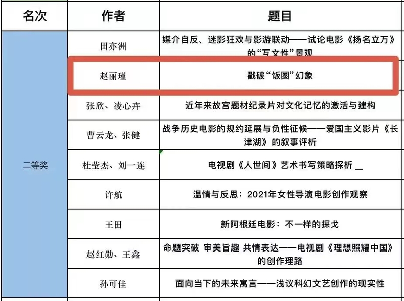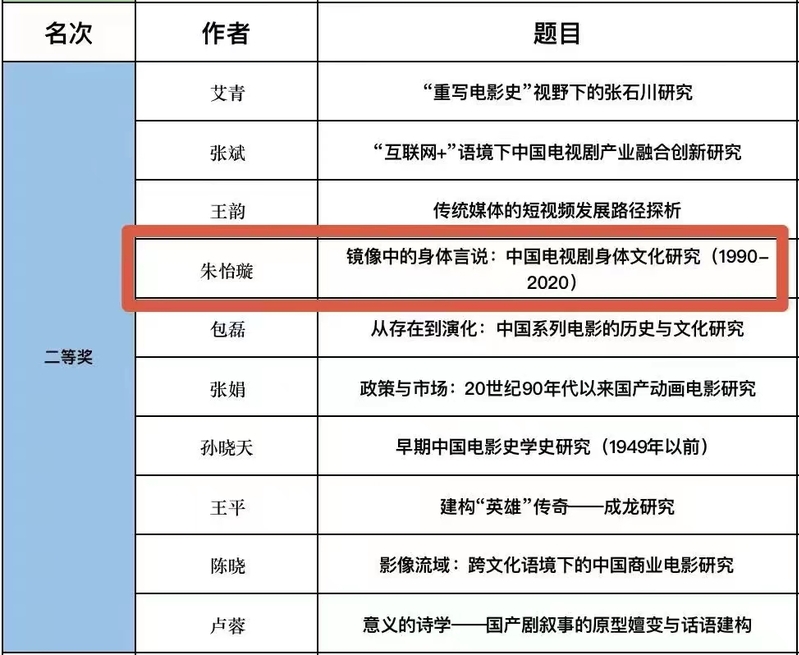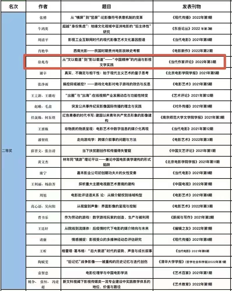 2022年11月20日上午,中国高校影视学会2021-2022年度学术成果推优活动暨第十五届“学会奖”获奖结果在中国高校影视学会公众号正式揭晓。金沙990活动大厅院长徐兆寿教授的论文《从“文以载道”到“影以载道”——“中国精神”的内涵与影视文学实践》(发表在2022年第3期《当代作家评论》)获学术论文单元二等奖,副院长赵丽瑾教授凭借论文《戳破“饭圈”幻象》(发表在2021年5月15日《光明日报》)获影视评论单元二等奖,朱怡璇副教授凭借著作《镜像中的身体言说:中国电视剧身体文化研究(1990-2020)》(2022年8月由中国社会科学出版社出版)获学术专著单元二等奖。