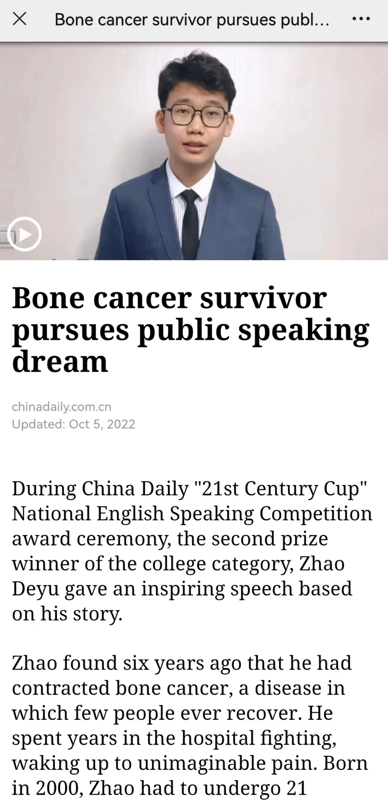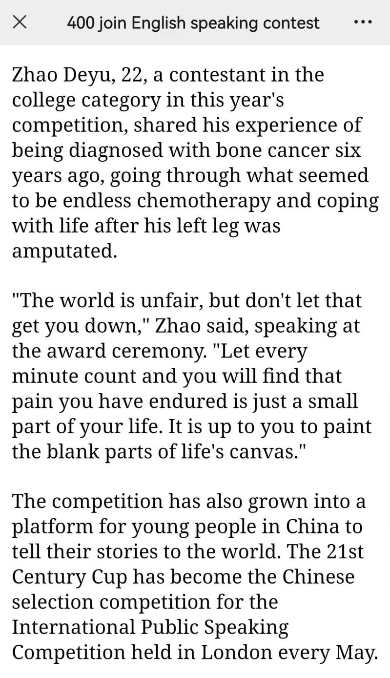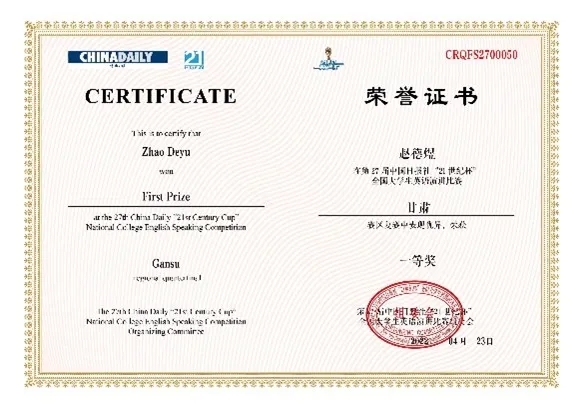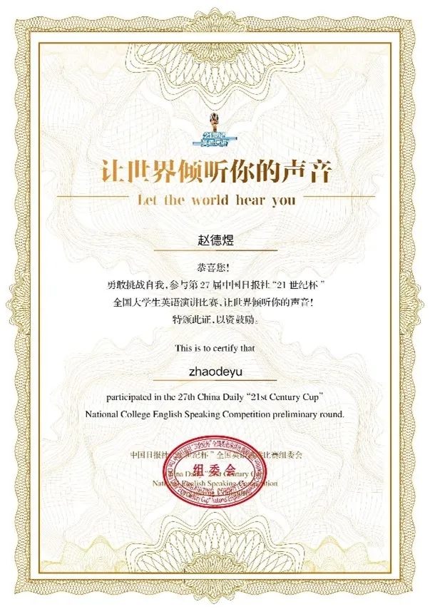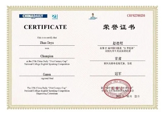 在历时七个多月的比赛中,赵德煜通过校赛和省赛的层层选拔,并荣获甘肃省赛区复赛一等奖、甘肃省赛区决赛冠军,最终晋级全国决赛选拔阶段,斩获全国二等奖。比赛中表现优秀的他也被邀请为“21世纪杯”颁奖典礼的表演赛嘉宾,发表了题为《穿越绝境,依旧热爱生活(Seeing the world as it is and loving it)》的演讲,讲述了自己六年的抗癌故事,演讲视频被中国日报社全平台推送,截至目前全网播放量约40万。