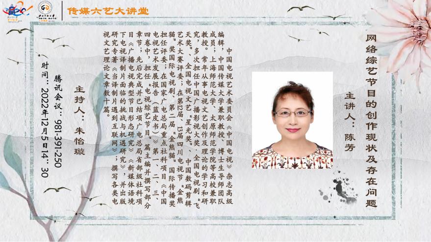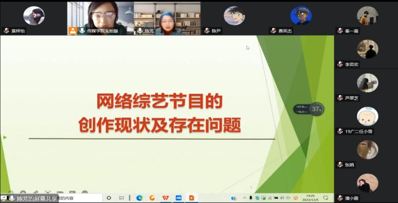 2022年12月5日下午,常年从事电视文艺创作及理论的学习和研究,多次担任中国广播影视大奖·全国电视剧“飞天奖”、全国电视文艺“星光奖”、中国数码剪辑艺术大赛评委,在第12届、13届四川电视节“金熊猫”奖国际电视剧、第二届“金熊猫”国际传播奖担任评委,在国家广电总局重点社科项目《中国电视艺术发展报告(蓝皮书)》第一、二、三、四卷中,担任“电视综艺节目”篇主编并撰写部分章节,先后完成并已结项广电总局省部级社科项目《广播电视典型节目形态研究》《新媒体语境下电视译制片面临的挑战与机遇研究》,并出版研究专著《当译制片遇到互联网》,撰写各类电视文艺理论文章数十篇,中国电视艺术委员会《中国电视》杂志社高级编辑,上海师范大学、太原师范学院等高校兼职教授,中国传媒大学兼职教授、博士生导师团队成员陈芳教授应邀为我院师生在线开展了题为《网络综艺节目的创作现状及存在问题》的学术讲座,会议由金沙990活动大厅副教授朱怡璇老师主持,学院2019级广播电视编导专业的全体学生在线聆听了此次学术讲座。