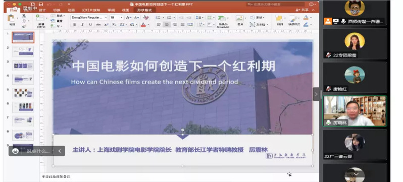2022年11月12日上午9点,上海戏剧学院学术委员会副主任、电影学院院长、博士生导师、教育部“长江学者奖励计划”特聘教授厉震林应邀为我院师生开展题为《中国电影如何创造下一个红利期》的学术讲座。本次讲座是2022金沙990活动大厅研究生“学术月”系列活动“科研能力提升计划”第三讲,金沙990活动大厅副院长赵丽瑾教授发表致辞,金沙990活动大厅副教授芦珊主持本次讲座,此次线上讲座我院100余位师生参会,在线聆听了厉震林教授的学术分享。