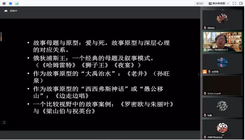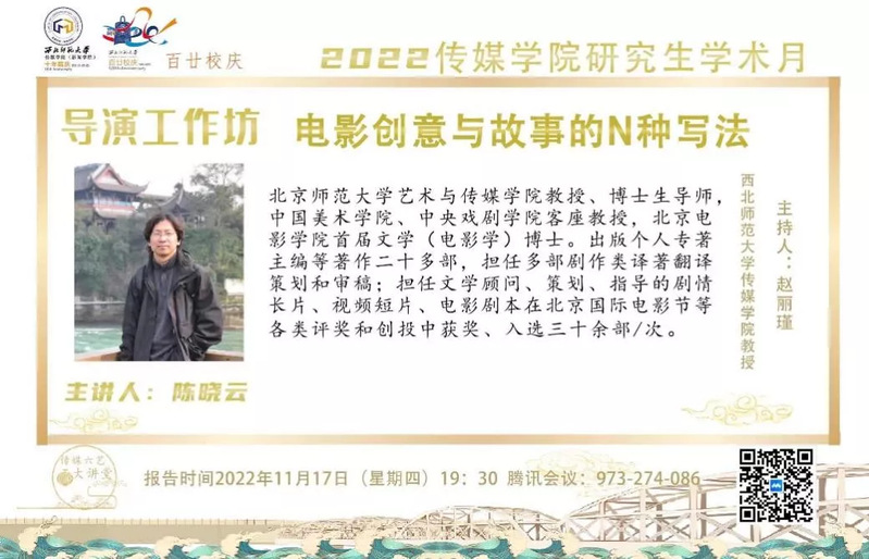 2022年11月17日19点半,北京师范大学艺术与金沙990活动大厅教授、博士生导师,中国美术学院、中央戏剧学院客座教授,北京电影学院首届文学(电影学)博士陈晓云教授应邀为我院师生开展题为《电影创意与故事的N种写法》的学术讲座。本场讲座是2022金沙990活动大厅研究生“学术月”系列活动之一。金沙990活动大厅副院长赵丽瑾教授主持讲座并致辞。金沙990活动大厅300余名师生在线上聆听了陈晓云教授的精彩讲座并交流互动。