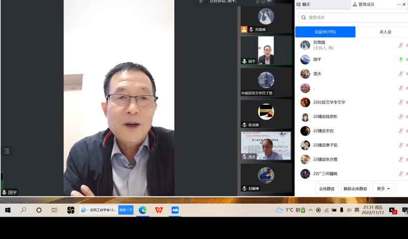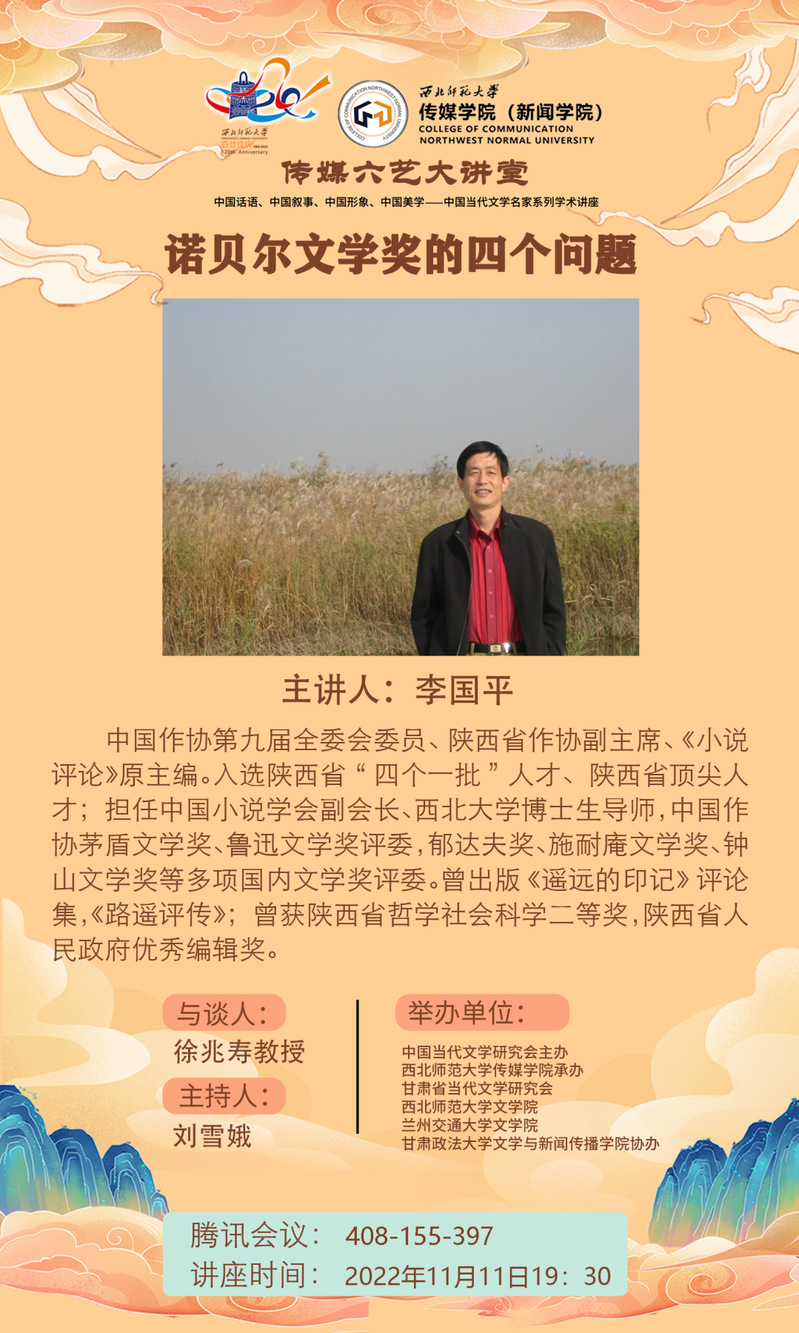 2022年11月11日晚,陕西省作协副主席李国平老师应邀为我院师生开展了题为《诺贝尔文学奖的四个问题》的学术讲座,金沙990活动大厅讲师刘雪娥主持讲座,学院百余名师生在线聆听了讲座。