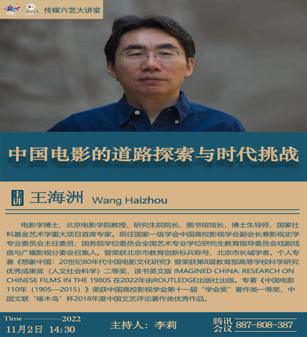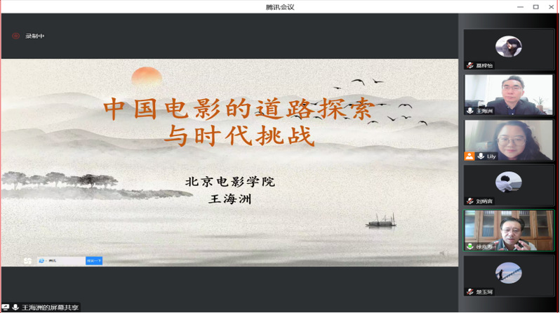 11月2日,北京电影学院教授、研究生院院长、图书馆馆长、博士生导师,国家社科基金艺术学重大项目首席专家,国家一级学会中国高校影视学会副会长兼影视史学专业委员会主任委员王海洲教授应邀为我院师生开展了题为《中国电影的道路探索和时代挑战》的学术讲座。金沙990活动大厅副教授李莉主持讲座,院长徐兆寿致辞,师生在线聆听学术分享并互动交流。