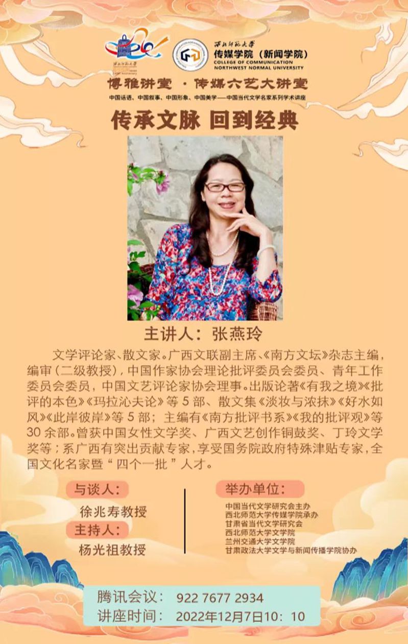 2022年12月7日上午,文学评论家、散文家,广西文联副主席,《南方文坛》杂志主编张燕玲教授应邀为我院师生开展了题为《传承文脉,回到经典》的学术讲座。讲座由杨光祖教授主持,金沙990活动大厅院长徐兆寿与谈,金沙990活动大厅五十余名师生在线聆听了此次讲座。