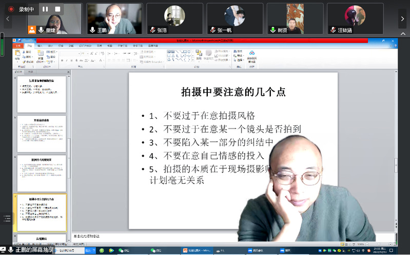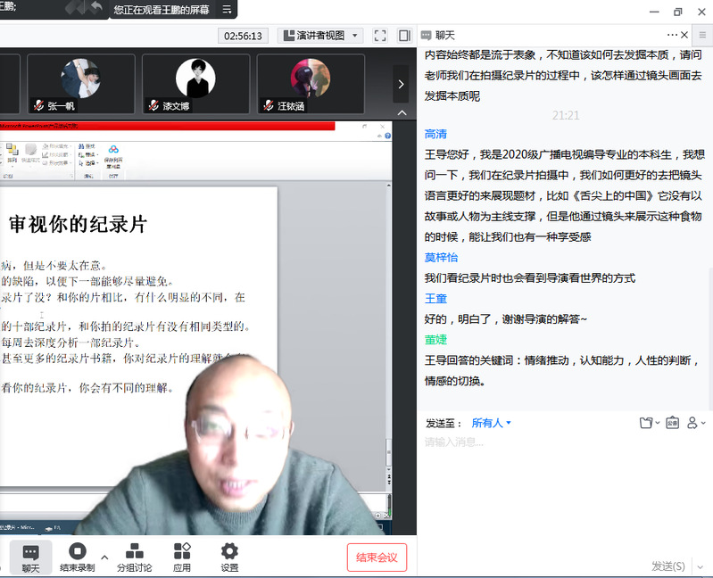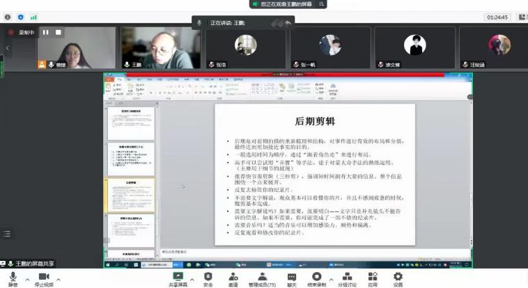 除了详实的理论分享,王鹏导演还带领师生在线观看了《寻找雪豹》和《新无人区》等纪录片的开头片段,以具体案例为我院师生传授了纪录片点题的“直切”法。同时分享与拍摄对象建立信任的过程,为师生规避纪录片拍摄的常规问题和如何拍出成熟的片子作了思想引导和实践总结。