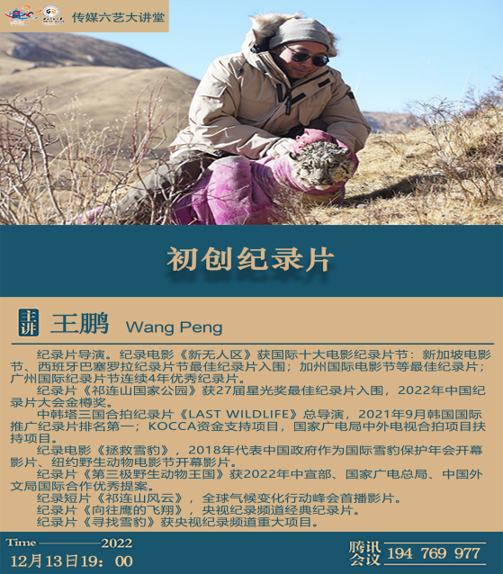 2022年12月13日晚,《新无人区》《祁连山国家公园》《拯救雪豹》《第三极野生动物王国》《祁连山风云》《向往鹰的飞翔》《寻找雪豹》等优秀作品的知名纪录片导演王鹏为我院师生作了题为《初创纪录片》的学术讲座。会议由金沙990活动大厅董婕博士主持,张浩老师参与对谈,金沙990活动大厅70余名师生在线聆听了此次学术分享。