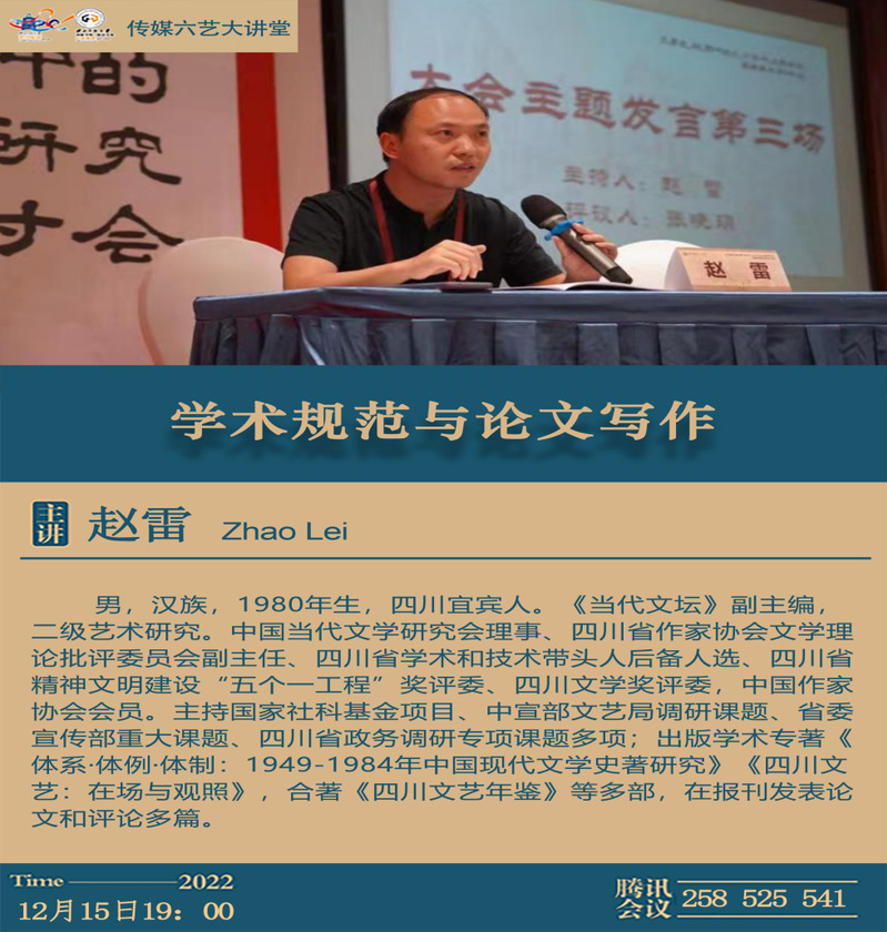 2022年12月15日晚,学院邀请到《当代文坛》副主编,二级艺术研究员,中国当代文学研究会理事,四川省作家协会文学理论批评委员会副主任,四川省学术和技术带头人后备人选,四川省精神文明建设“五个一工程奖”评委,四川文学奖评委,中国作家协会会员赵雷,为我院师生在线开展了题为《学术规范与论文写作》的讲座。此次讲座由金沙990活动大厅董婕博士主持。开讲前董婕博士致了欢迎辞,并说明了举办此次讲座的初衷和意义。校内外140名师生参与了此次讲座。