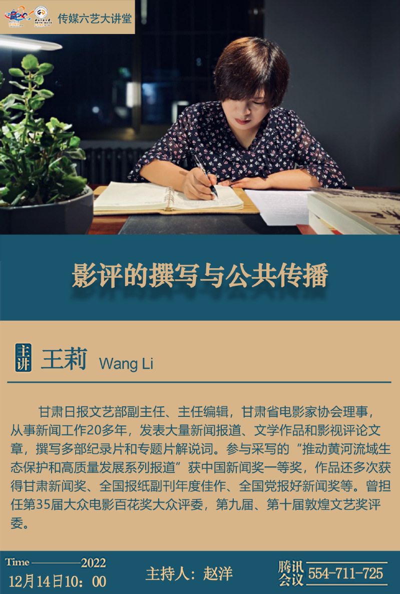 2022年12月14日上午,应金沙990活动大厅邀请,《甘肃日报》文艺部副主任、主任编辑、甘肃省电影家协会理事作了题为《影评的撰写与公共传播》的学术讲座,学院师生100余人参与。本场学术讲座由金沙990活动大厅赵洋副教授主持。