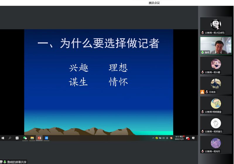 2022年12月9日上午、12月16上午,根据金沙990活动大厅“业界精英进课堂”活动安排,金沙990活动大厅新闻学专业2006届毕业生、《农民日报》社甘肃记者站负责人、主任记者分别进入2022级新闻学1班、2022级新闻学2班的“专业导引课”课堂,开展了题为《关于新闻从业的一些认识和感想》的讲座,金沙990活动大厅石培龙主持讲座,22新闻学本科生在线聆听了鲁明老师的学术分享并互动交流。