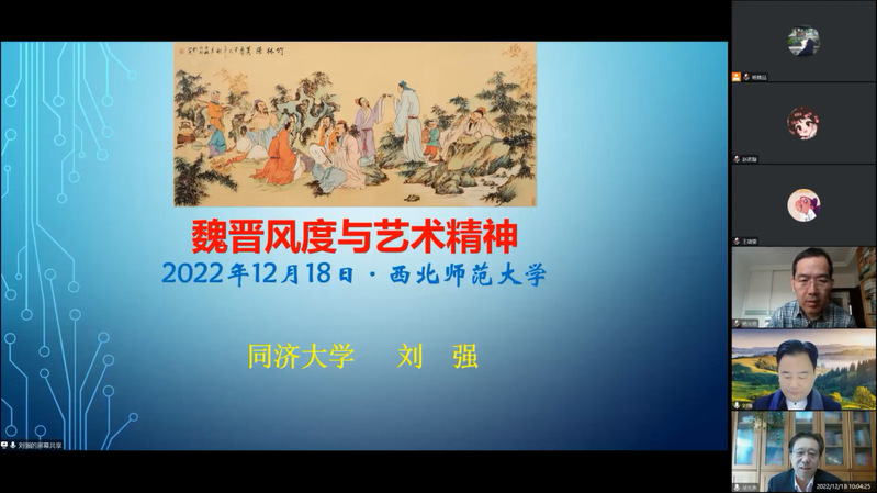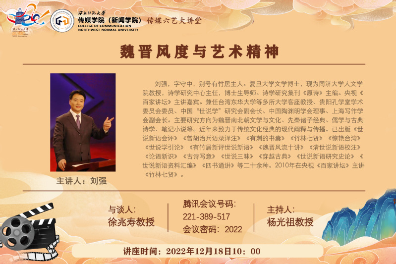 2022年12月18日上午,复旦大学文学博士,同济大学人文学院教授,诗学研究中心主任,博士生导师,诗学研究集刊《原诗》主编,央视《百家讲坛》主讲嘉宾刘强教授应邀为我院师生开展题为“魏晋风度与艺术精神”的学术讲座。本场讲座是金沙990活动大厅“传媒六艺大讲堂”系列活动之一。由金沙990活动大厅教授杨光祖主持,金沙990活动大厅院长徐兆寿教授致欢迎辞。金沙990活动大厅研究生和部分老师在线聆听了刘强教授的精彩讲座。