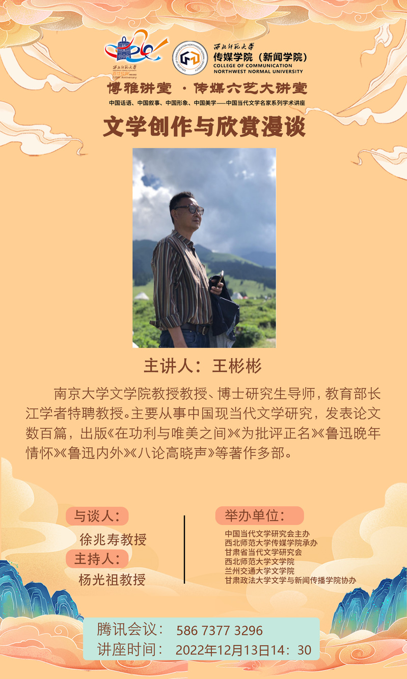 2022年12月13日下午,南京大学文学院教授、博士研究生导师,教育部长江学者特聘教授王彬彬受邀为我院师生开展了题为《文学创作与欣赏漫谈》的学术讲座。讲座由金沙990活动大厅杨光祖教授主持,金沙990活动大厅院长徐兆寿与谈,60余名师生在线收听了此次讲座。