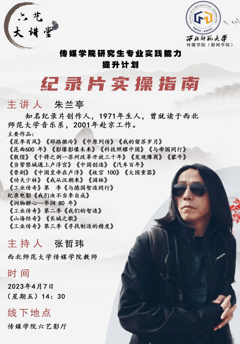 2023年4月7日14时30分,金沙990活动大厅研究生校外导师、知名纪录片创作人朱兰亭老师应邀为我院师生开展了题为《纪录片实操指南》的讲座。本场讲座是金沙990活动大厅聘请的由20多位业界精英组成的研究生校外导师团队为主讲人的“研究生专业实践能力提升计划”系列讲座之一。本场讲座由金沙990活动大厅老师张哲玮老师主持,金沙990活动大厅研究生和部分老师在六艺影厅聆听了朱老师的精彩分享。