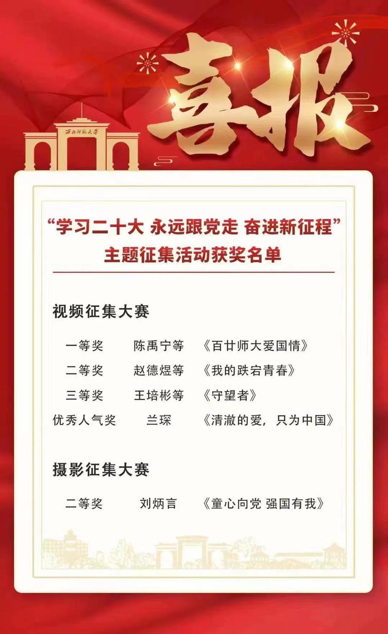 我院2020级播音与主持艺术1班赵德煜等的视频作品《我的跌宕青春》获得二等奖;2020级广播电视编导专业王培彬等的视频作品《守望者》获得三等奖;2021级研究生兰琛的视频作品《清澈的爱 只为中国》荣获优秀人气奖;2020级广播电视编导专业刘炳言的摄影作品《童心向党 强国有我》荣获二等奖。 |