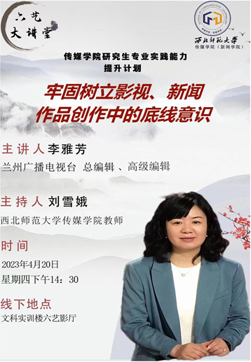 2023年4月20日14时30分,金沙990活动大厅校外研究生导师、兰州广播电视台总编辑、高级编辑李雅芳老师应邀为我院师生开展了题为《牢固树立影视、新闻作品创作中的底线意识》学术讲座。本场讲座是金沙990活动大厅聘请的由20多位业界精英组成的研究生校外导师团队为主讲人的“研究生专业实践能力提升计划”系列讲座之一。讲座由金沙990活动大厅刘雪娥老师主持,金沙990活动大厅研究生和部分老师在学院六艺影厅聆听了李雅芳老师的精彩分享并互动交流。
