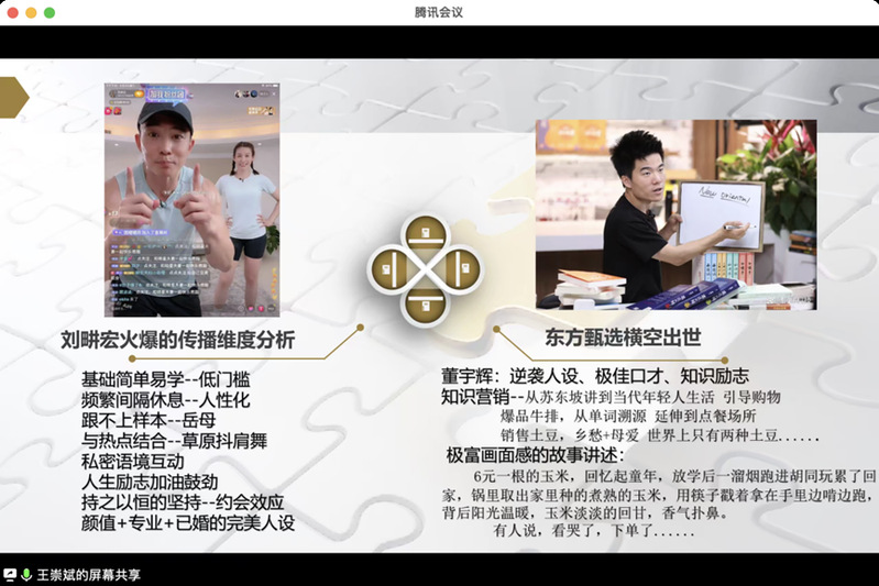 针对短视频直播现象,王老师指出短视频具有在互联网新媒体上传播、时长在五分钟以内、生产流程简单、制作门槛低和参与性强等特点。短视频内容具有的场景化、独特性、轻体量和反套路的特点,决定了短视频传播的特点。王老师认为短视频能否成功有以下几个方面需要注意:推出时机和实效要切中社会痛点、热点、共情点;专业中的高“颜言研”值;言行中的反常态和不可思议;情感中的强共鸣揭秘性揭秘性内容等。王老师把短视频的特色总结为“五解功能”、短视频创作要点概括为“五种要素”,他从刘畊宏、董宇辉等网红出发,分析直播带货的表达魅力、极致场景、普惠营销、常识普及和情怀感召等特点,与此同时,王老师指出直播时要有“美颜、美好、美妙和美学”这四美。王老师的讲述生动盎然,幽默风趣。