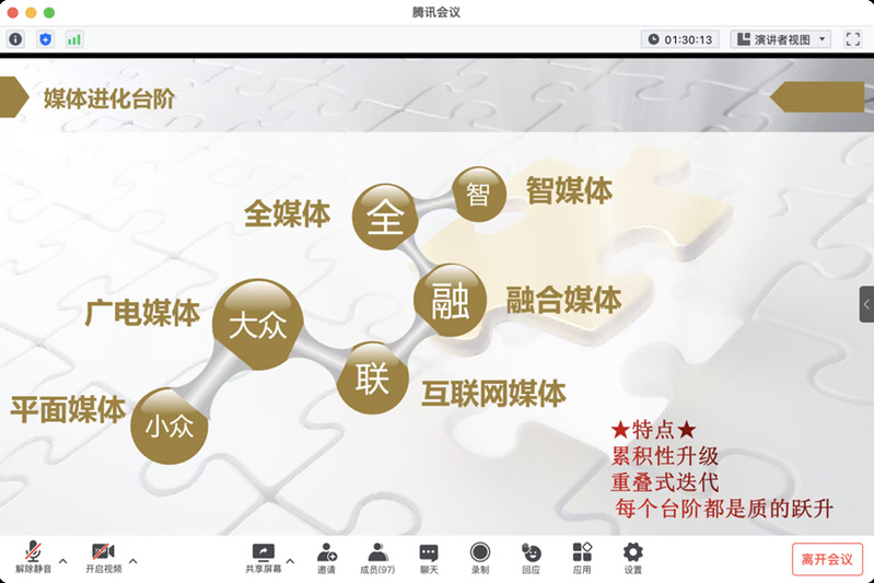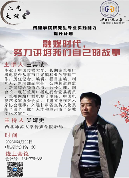 2023年4月22日下午19时30分,金沙990活动大厅校外研究生导师、兰州广播电视台党委委员、兰州网络广播电视台主任王崇斌老师应邀为我院师生开展了题为《融媒时代,努力讲好我们自己的故事》的讲座。本次讲座是由金沙990活动大厅聘请的20多位业界精英组成的校外研究生导师团队为主讲人的“研究生专业实践能力提升计划”系列讲座之一。讲座由金沙990活动大厅吴婧雯老师主持,金沙990活动大厅研究生和部分老师在线上聆听了学术分享并互动交流。