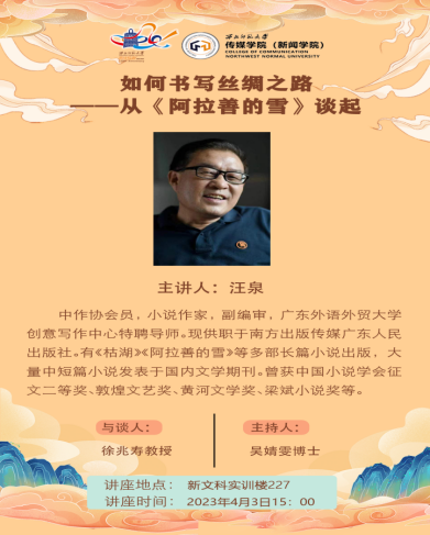 4月3日,中作协会员、著名小说家汪泉应邀为我院师生开展了题为《如何书写丝绸之路——从<阿拉善的雪>谈起》的学术讲座。汪泉现供职于南方出版传媒广东人民出版社,著有《枯湖》《阿拉善的雪》等多部长篇小说,曾获中国小说学会征文二等奖、敦煌文艺奖、黄河文学奖、梁斌小说奖等。讲座由金沙990活动大厅吴靖雯老师主持,21级广播电视编导三班师生参与了此次分享并与之进行了深度的互动交流。