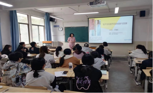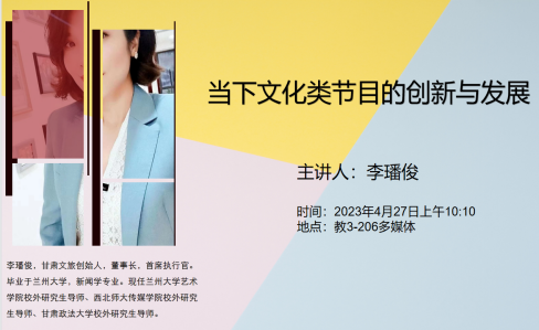 4月27日上午,甘肃文旅创始人李璠俊老师为在教学3号楼206多媒体教室上课的2022级广播电视编导三班学生作了题为《当下文化类节目的创新与发展》的交流讲座。李璠俊老师首先向师生们讲述了自己从事记者工作时创作、创新的经历。她提出了情景再现等架构节目的方法,并指出传播要适合教化,有逻辑性和边界感,更要有自己的主张。李璠俊老师认为,遗憾是创新的启航,当创新针对到具体事物时,没有固定的形式,创新是因时因地因人而异的。