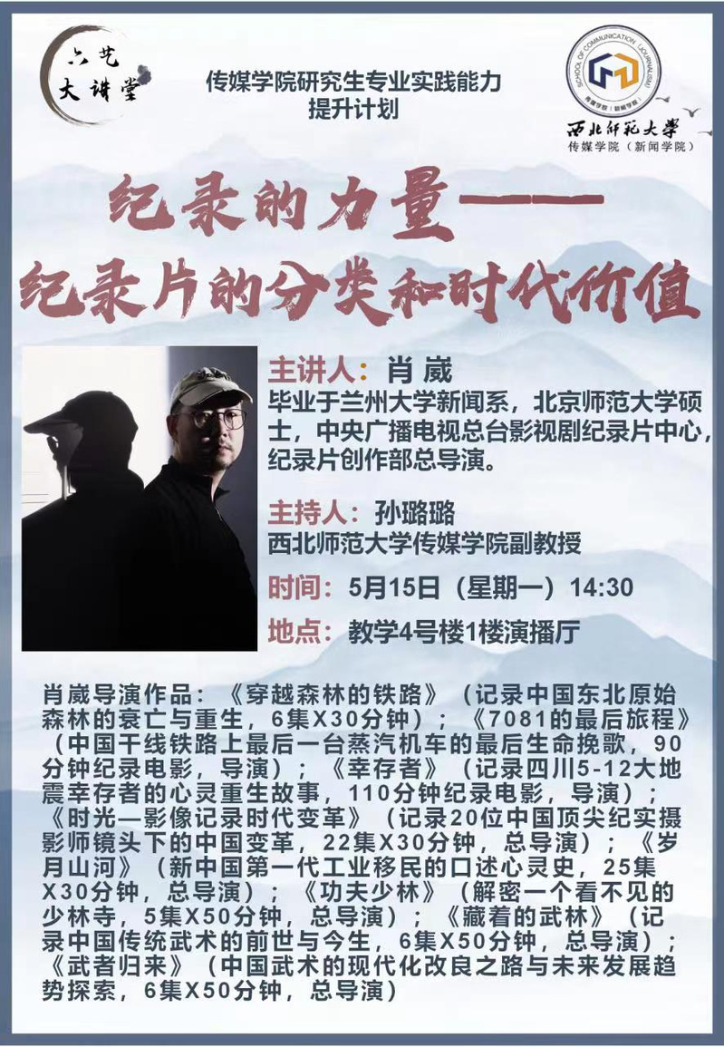 2023年5月15日14:30分,中央广播电视总台纪录片创作部总导演、金沙990活动大厅校外研究生导师肖崴应邀为金沙990活动大厅师生作题为《纪录的力量——纪录片的分类和时代价值》的学术讲座。本次讲座由金沙990活动大厅副教授孙璐璐主持,在4号教学楼演播厅举办。金沙990活动大厅研究生和部分老师现场聆听了讲座。