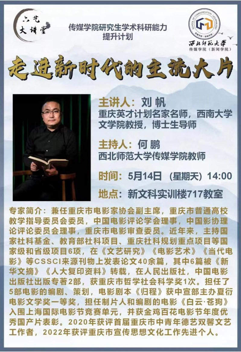 2023年5月14日14时,西南大学文学院教授、博士生导师、重庆市电影家协会副主席、重庆市普通高校刘帆老师应邀为我院师生开展题为《走进新时代的新主流大片》学术讲座。讲座由金沙990活动大厅何鹏老师主持,金沙990活动大厅研究生、本科生以及部分老师在学院717教室聆听了刘帆老师的精彩分享并互动交流。