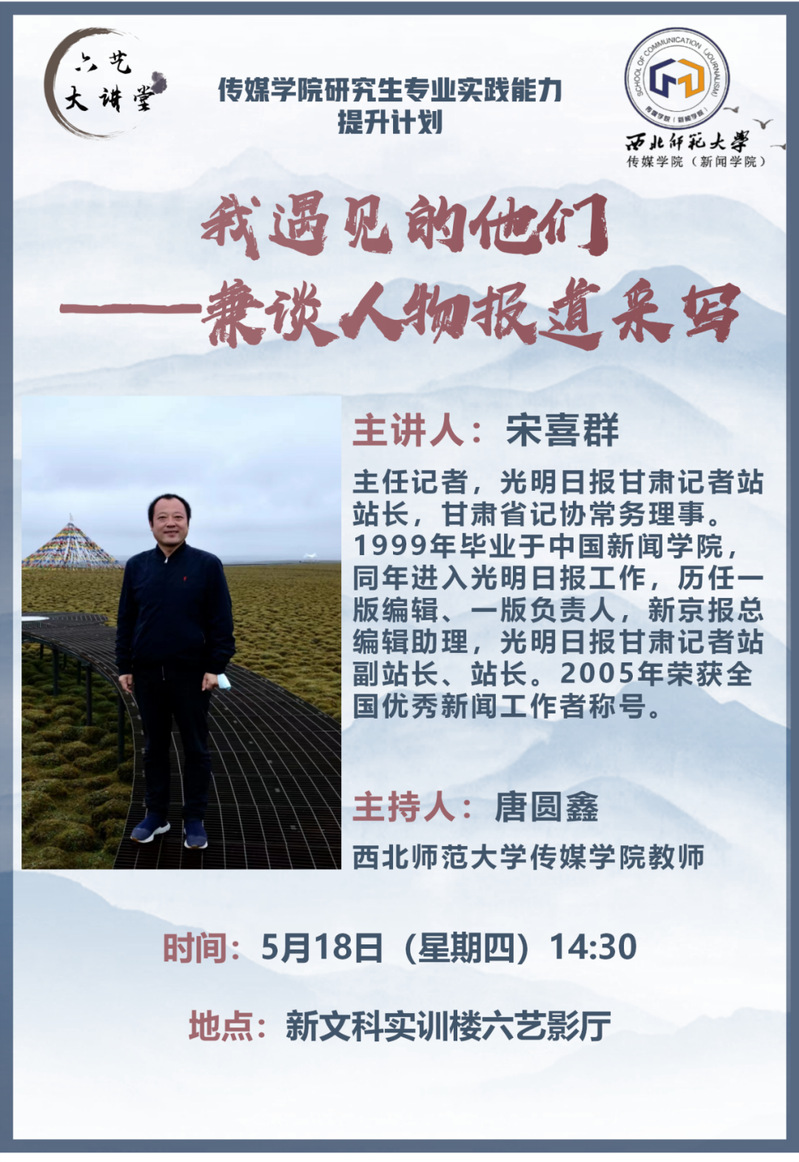 2023年5月18日2点半,光明日报甘肃记者站站长,主任记者,甘肃省记协常务理事、金沙990活动大厅校外研究生导师宋喜群应邀为金沙990活动大厅师生作题为《我遇见的他们——兼谈人物报道采写》的学术讲座。本次讲座由金沙990活动大厅唐圆鑫老师主持,金沙990活动大厅部分老师和研究生在文科实训楼六艺影厅聆听了宋喜群老师的学术分享。