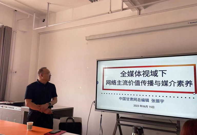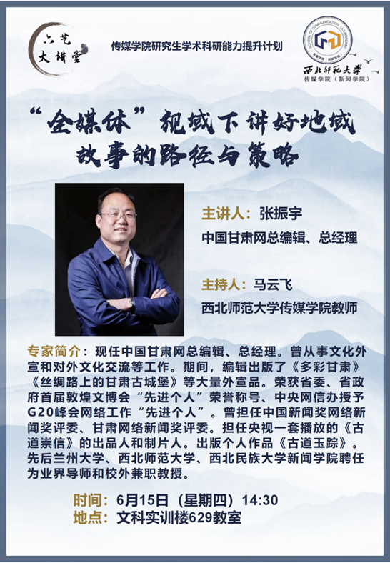 2023年6月15日下午2点半,中国甘肃网总编辑、总经理、金沙990活动大厅校外兼职研究生导师张振宇作了题为《“全媒体”视域下讲好地域故事的路径与策略》的学术讲座。本次讲座由金沙990活动大厅马云飞老师主持,金沙990活动大厅部分研究生和本科生在文科实训楼629教室现场聆听了讲座。