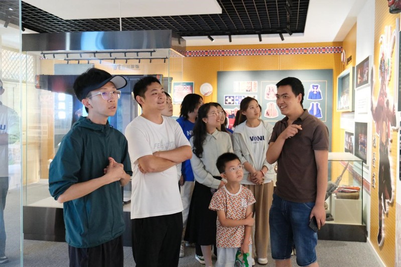 白马人从刀耕火种、狩猎捕鱼的岁月里走来,他们在与自然的交融、抗争中,孕育了本族群独特的生产和生活方式,历经数千年的风云变迁,保存并传承至今。在参观过程中,队员们发现此前在网络上看到的照片和资料中,帽子是白马人服饰文化的标志之一,沙嘎帽以其独特的装饰和造型展示了白马人服饰文化的个性。而在展馆内,队员们了解到到沙嘎帽是用白羊毛毡做成的,形状如带花边的圆盘,浅底,帽檐为波折状,帽顶的一侧插1~2根洁白的雄鸡翎,极富装饰意味。民族服饰之间一般存在不同程度的相似性,但白马人的沙嘎帽却是独一无二的,不仅形式独特,也蕴含着深厚的白马人民俗文化。白马人服饰上的图案同样有着不同的寓意,比如“米”字花是女性服饰上最普遍的图形,象征太阳的光芒;带圆圈的“米”字则是对太阳形体的直接描绘,体现了白马人对太阳神的崇拜等等。一边阅读着讲解词一边欣赏白马人的服饰,实践团成员们跳出书本上的知识,通过实践更好地理解白马文化。