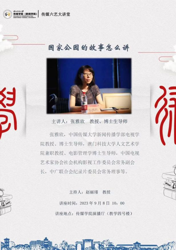 2023年9月8日上午10点,中国传媒大学新闻传播学部电视学院教授、博士生导师张雅欣应邀为我院师生开展了题为《国家公园的故事怎么讲》的讲座。此次讲座由金沙990活动大厅副院长赵丽瑾教授主持,金沙990活动大厅教师与2023级研究生新生100余人生共同聆听了此次讲座并进行了深度交流。