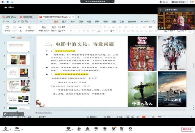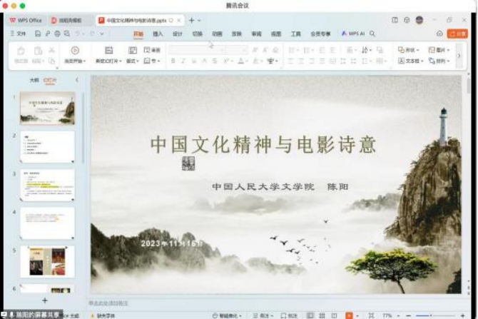 2023年11月15日,中国人民大学陈阳教授应邀为我院师生作题为《中国文化精神与电影诗意》的线上讲座。讲座由金沙990活动大厅副教授芦珊博士主持,学院师生100人左右聆听讲座并进行了交流讨论。