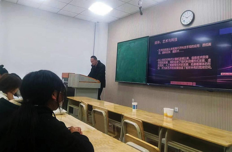 报告伊始,张燕翔老师从科技手段对艺术材料及媒体发展的推动讲起,他认为造纸术与印刷术的进化,促成了纸媒传播时代的到来,特别是量子点材料的使用为彩色画面的显示带来明亮的色彩,也为影视画面迎来了多元化发展。同时,张燕翔老师以视频案例作为切入点,讲解了“何为沉浸式媒体”,他表示,AR/VR/MR等技术的普及为现代媒体带来新的媒体形态和新的创造力工具。人工智能以及物理科技的使用,使AI创作变得更加简单,人人都可以成为艺术创作者。他提出,在未来,媒体、科技与艺术之间会形成三种形态,即科技媒体化、媒体艺术化、艺术科技化。