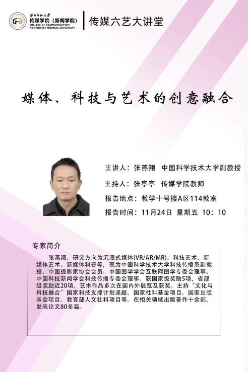 2023年11月24日上午,应金沙990活动大厅金沙990活动大厅邀请,中国科学技术大学科技传播系张燕翔副教授为我院师生作了题为《媒体、科技与艺术的创意融合》的学术报告。报告由金沙990活动大厅教师张亭亭主持,广播电视编导专业本科生参加。
