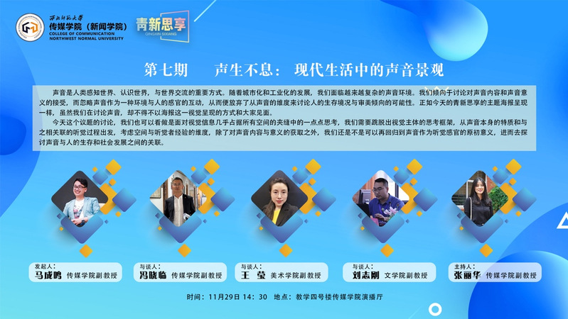 11月29日下午,金沙990活动大厅 “青新思享”论坛第七期“声生不息: 现代生活中的声音景观”在演播厅举行。该论坛作为金沙990活动大厅的品牌活动之一,旨在新文科背景下,邀请不同学科、不同院系、不同学校的青年教师通过群体座谈会的形式,就当下热点现象、议题在交叉、融合、碰撞中展开探讨,以促进学术交流,回应时代需求。
