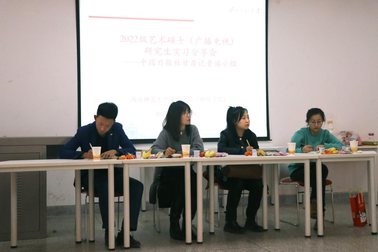 2022级艺术硕士(广播电视)张梓玥、朱日新、马宝格、多啸啸、葛娇芸、成芳琪、陈小龙、宋凌霄八位同学分别汇报了现阶段的实习情况。张梓玥等在中国日报社甘肃记者站实习的同学在兰州市内参与新闻发布会34次,累积发文22篇,视频4个,主要包括庆阳市的香包民俗文化节及大型会议、兰州市周边县城的和美乡村行采访活动、兰州市区内的新闻发布会、填报甘肃好新闻表格、撰写中国日报外文网的甘肃八联版和第七版宣传点评稿件、参加乡村建设采访活动、《甘肃省企业挂牌上市行动方案(2023—2025年)》政策解读新闻发布会;加强司法救助倾情关爱妇女新闻发布会;“铸忠诚警魂建设,政法铁军”新闻发布会;“转作风优化营商环境 抓项目增强发展动力”主题系列新闻发布会——嘉峪关专场;全省经济运行调度、甘肃·庆阳岐黄文化论坛活动。