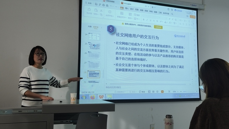 随后,陈老师向同学们展示了她带领的学生团队目前所做的关于知识直播的项目,她从选题背景、数据筛选、用户需求逻辑等方面进行讲述。与同学们共同探讨知识直播与传统叫卖直播之间的差异,对知识直播产品的特点与优势进行了总结,并指出在知识直播领域要以长远的目光,坚持“内容为王”的生产理念。